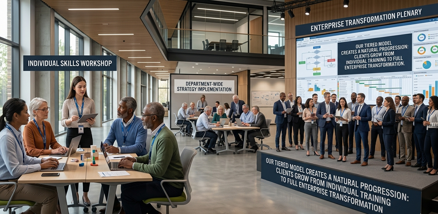 Our tiered model creates a natural progression — clients grow with us from individual training to full enterprise transformation.