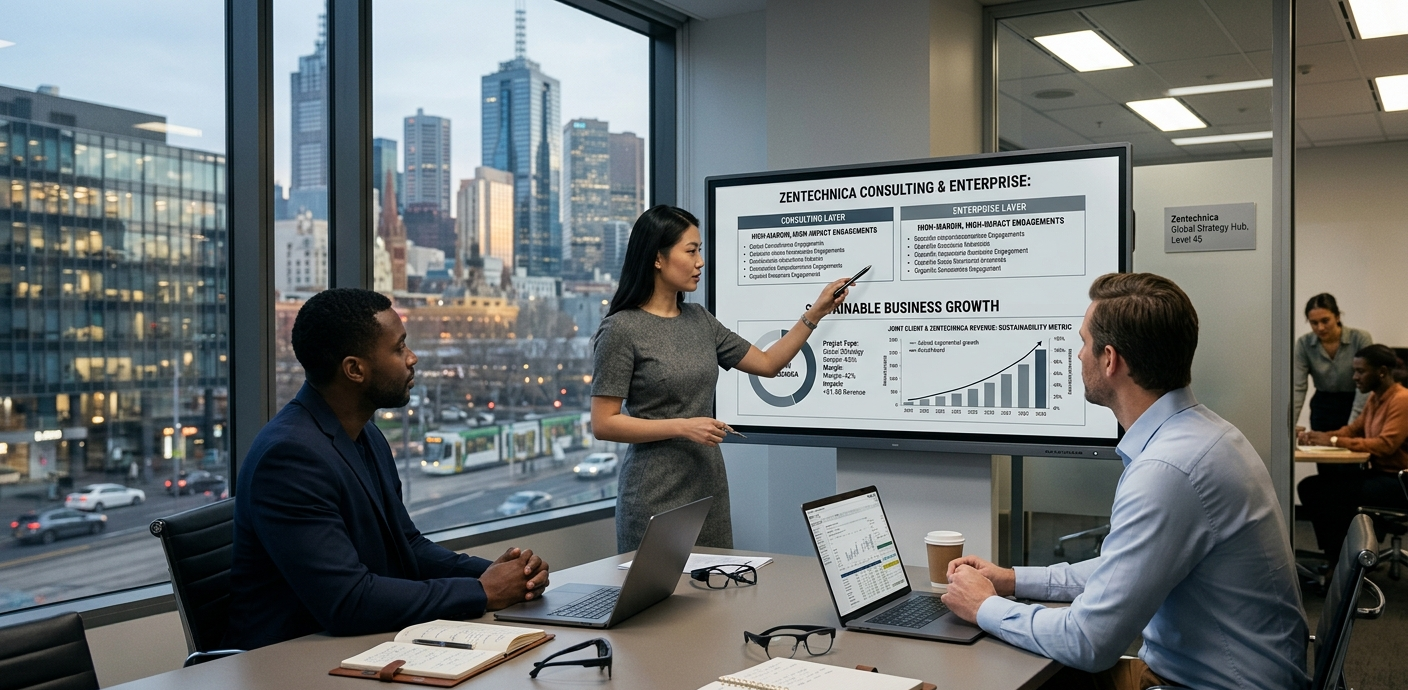 The consulting and enterprise layers deliver high-margin, high-impact engagements — ensuring sustainable business growth for Zentechnica and our clients.