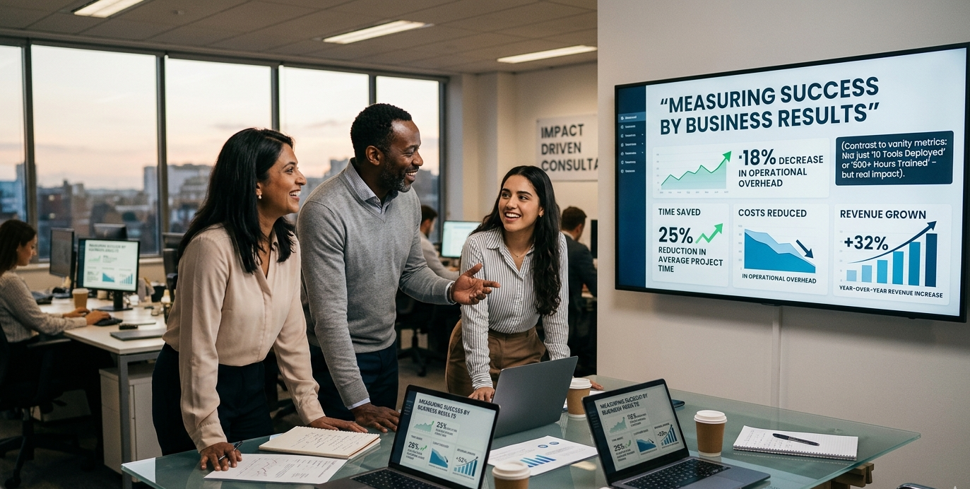 We measure success by business results — time saved, costs reduced, revenue grown — not by tools deployed or hours trained.